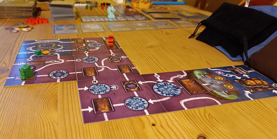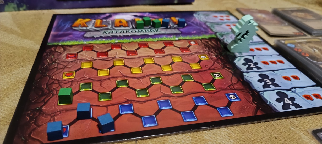 Amit eddig elmondtam, az igaz a Klank! alapjátékra is, a Katakombák pár változtatása viszont még jobbá teszi az élményt. A normál Klank! egy darab, nagy, kétoldalú játéktáblával rendelkezik, így értelemszerűen azon két, fix elrendezésű játéktér, fix mezőkkel, útvonalakkal. A Katakombák viszont lapkákkal dolgozik, így amikor mozgunk, ténylegesen mi fedezzük fel a kazamatát, nem tudhatjuk biztosra, mi vár minket egy út túloldalán, ráadásul ezek a lapkák még forgathatók is. Az újrajátszhatóságot ez nagyban növeli és egy kis izgalmat is visz a játékba ráadásul tényleg úgy érezhetjük, mi fedezzük fel elsőként a sárkány barlangját. Egyes lapkákon szellem szimbólumok is láthatók, ilyenkor egy fehér kockát is oda kell tennünk a többi közé és amikor a zsákból ezt húzzuk ki, akkor mindenki sérül. Ráadásul a fehér kocka ezután vissza is kerül a játéktérre, nem szabadulunk meg tőle. Csúnya dolog! Több piactérrel találkozunk viszont, egyes kristálybarlangokban gyógyulhatunk is, meglátogathatunk szentélyeket, amiknél egy kocka lehelyezésekor pénzt kapunk, annyit, amennyi ilyen szentélynél már jártunk korábban és sokat segíthetnek rajtunk a portálok is, amik a játéktér egyik pontjából a másikba teleportálhatnak minket. Némely helyeken vagy éppen kártyák által kiszabadíthatunk túszokat is, őket sem érdemes elhanyagolni.