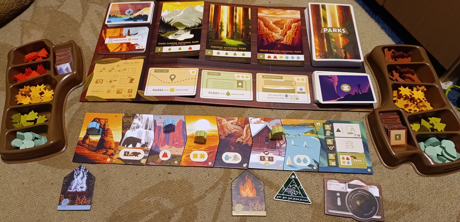 A PARKSban túrázókként navigálunk négy évszakon át egy egyre hosszabbodó túraútvonalon, miközben kulacsunkba vizet gyűjtögetünk, hátizsákunkba meg különböző nyersanyagokat, amiket beváltva meglátogathatjuk az USA legszebb, legnagyobb és „leglegebb” nemzeti parkjait. Kellemes, nyugodt, lazulós kikapcsolódás, ellentétben a valós életbeli megfelelőjével (bár itt most a nagy természetjárók biztos felhördülnek, bocsi), a másik játékos elől csak mezőket foglalhatunk el, illetve kártyákat vehetünk el, így még akkora konfliktus sem alakul ki. A központi mezőn, a túraútvonalon két figurát mozgatunk és csak előre mehetünk, viszont mi döntjük el, hogy mennyit lépünk. Ez azért fontos, mert aki elsőként ér a legutolsó helyszínre, zsíros bónuszokat kap, de nagyon sietni sem érdemes, mert akkor meg a forduló közbeni járandóságokról maradunk le. Figyelni kell a többiek és a magunk ritmusát, ami már egy finom döntési helyzet. Emellett a játékban vannak célkártyák is, amik extra pontokat biztosítanak, amennyiben teljesítettük őket, csak győzzük figyelemmel!