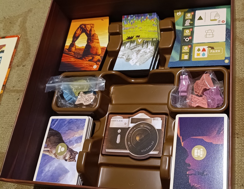 Meglepő módon engem annyira nem zavar. Kezdjük azzal, hogy a PARKS, ahogy azt már érintőlegesen említettem, egyszerűen gyönyörű! Rengeteg különböző művészt kértek fel a kártyák megrajzolásához, így nem csak színvilágukban, de stílusukban, hangulatukban is eltérőek, természetesen egészséges keretek között. Hiába, ez még a nagy AI hullám előtt jelent meg! Öröm kézbe venni, vizsgálgatni ezeket a kártyákat és izgalommal teli várakozással felhúzni a pakliból a következőt, hogy az vajon melyik parkot ábrázolja, mit lehet tudni róla és hogyan is néz ki. Kipakolás után bizsergető érzés az asztalra nézni, a komponensek minősége pazar. Emellett ki kell még emelnem a sajnos ritkaságszámba menő kiváló inzertet is: mindennek megvan a helye, a ki- és elpakolás egyáltalán nem tűnik munkának! Mindezen összhatások miatt tényleg kényelembe tudjuk magunkat helyezni és átadhatjuk magunkat ennek a chilles játékélménynek. Hacsak nem vagy nagyon számolgatós, a győzelemre ráfeszülős játékos, itt nem fogsz idegeskedni.